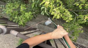 現場に行ってみると、ゴミ袋は木々の間に挟まれていて、しかも枝に絡まっている状態。