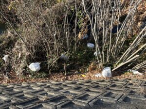 あちこちに置き去りにされたごみ袋。風や雨で流れ着いたものもあれば、人の手によって残されたものもあるのでしょう。