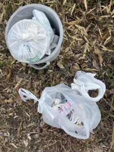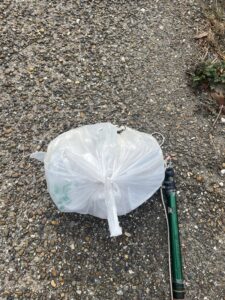 木の後ろに隠れるように引っかかっているゴミ袋。